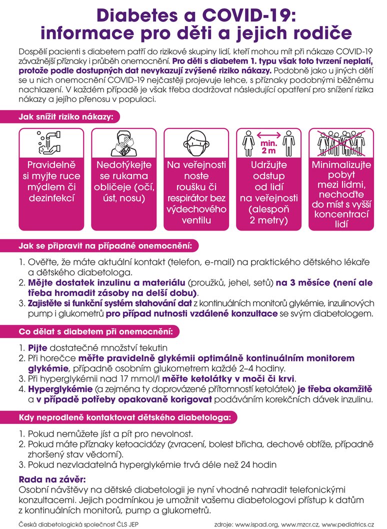 Jedná se ale o lidi starší, a zejména ty, u nichž došlo k rozvoji pozdních komplikací, které snižují přirozenou obranyschopnost organismu. Nejsou žádné zprávy o tom, že by děti s diabetem 1. typu měly vyšší riziko nákazy COVID-19, či že by pro ně tato nemoc byla nebezpečnější než pro děti bez diabetu. Pro děti obecně jsou typické velmi mírné příznaky, mladší věkové skupiny tvoří důležitý rezervoár viru v populaci, ale je samotné tento virus zvýšeně neohrožuje.